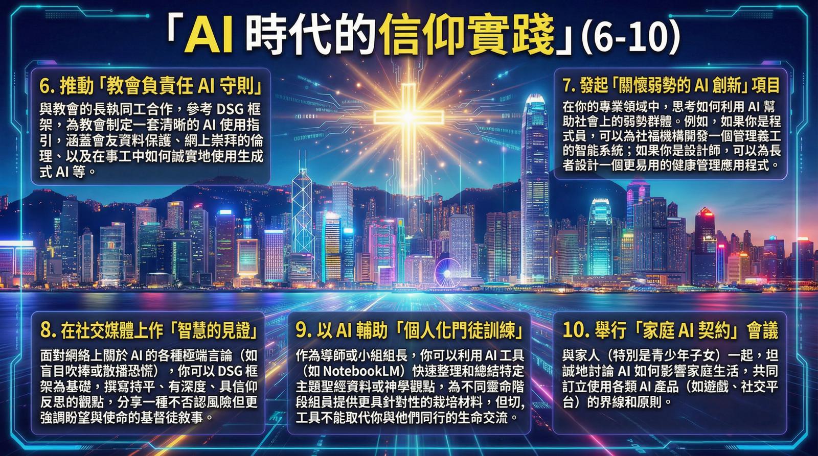 明白了 DSG 框架,我們就可以將之應用在生活每個層面。以下是特別為身處香港的我們提出 10 個具體的 AI 應用建議,讓我們不僅是科技的使用者,更是信仰的踐行者和影響者(見上圖)